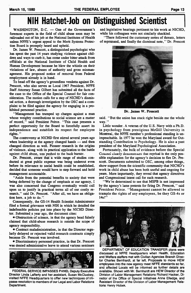 "The Federal Employee" reports under "NIH Hatchet-Job on Distinguished Scientist" that Prescott as "One of the Government's foremost expert in the field of child abuse soon may be railroaded out of his job...".