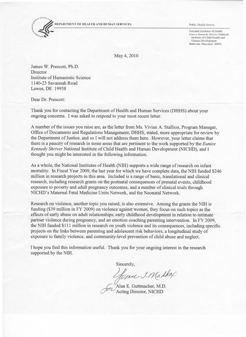 Guttmacher, M.D. Alan (2010), Director NICHD, Letter of response of